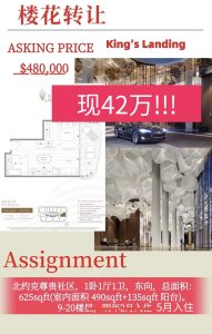 楼花转让:北约克King’s Landing 1卧单位$42万!北约克尊贵社区,1卧1厅1卫,东向,总面积:625sgft(室内面积490sqft+135sgft阳台) 今年5月交房
