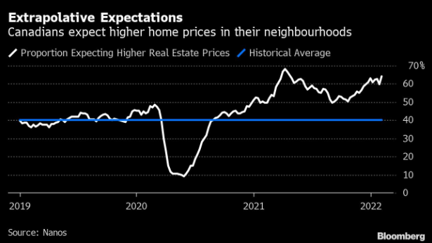 尽管央行和监管官员警告称借贷成本将上升并可能冲击房地产市场,但上周对全国房地产市场的乐观情绪升至接近创纪录水平。Nanos Research Group 为彭博新闻社进行的最新每周调查显示, 约 64% 的加拿大人预计其社区的房地产价值将在未来六个月内上涨。这比上周的 60% 有所上升,使其成为有记录以来最快的 7 天信心增长之一。 信息来源:加拿大彭博新闻社(Bloomberg News) 点击查阅信息来源.